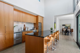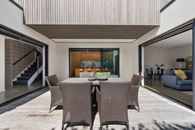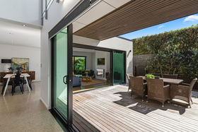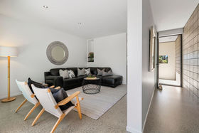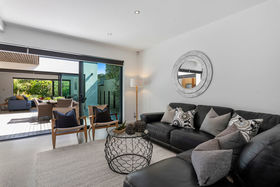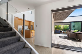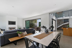 A box on a box, two levels and architecturally designed by Alistair Dodds, large glass stackers open this home up to a private sheltered, internal courtyard for serious entertaining. Showcasing clean modern lines, high stud ceilings, polished concrete flooring, walls of glass, together with the three living spaces, ooze relaxed Omaha living.